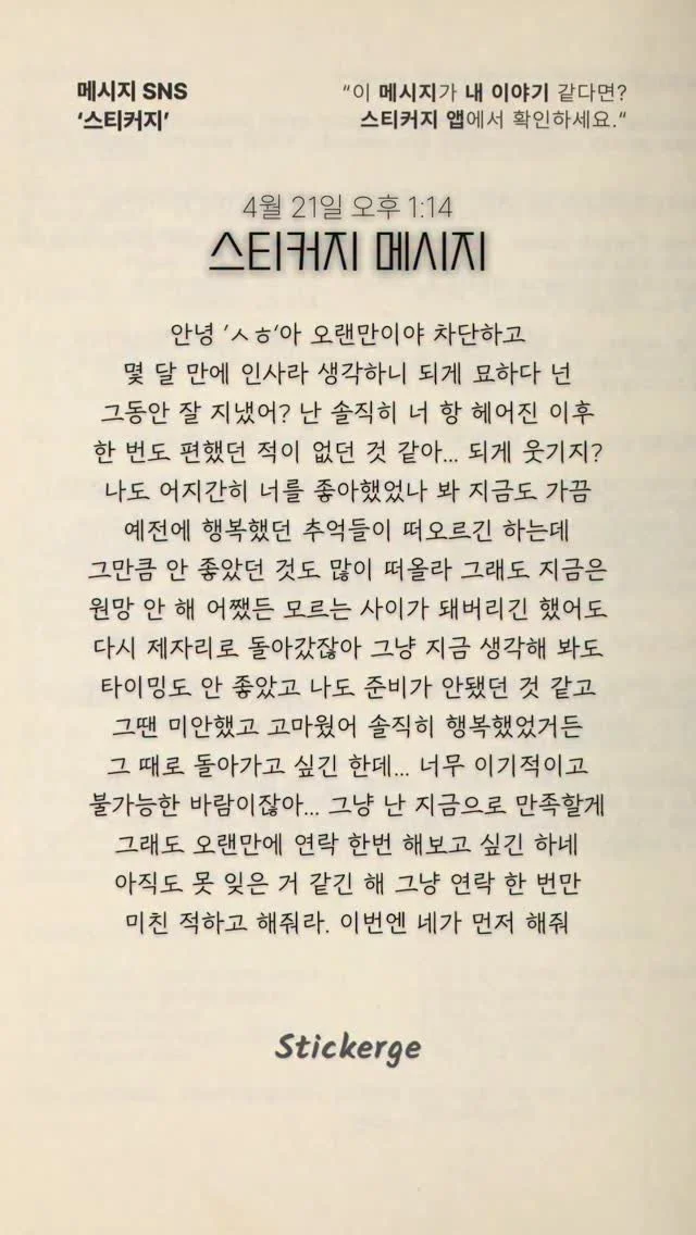 잘지내? 미안했어 보고싶다 넌 어때? 고마웠어 이젠 괜찮아 나도 미안해 우리 둘다 어렸다. 그치? 안녕! 여기에서 널 아직도 응원해