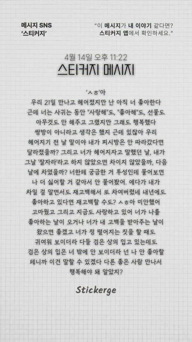 잘지내? 미안했어 보고싶다 넌 어때? 고마웠어 이젠 괜찮아 나도 미안해 우리 둘다 어렸다. 그치? 안녕! 여기에서 널 아직도 응원해